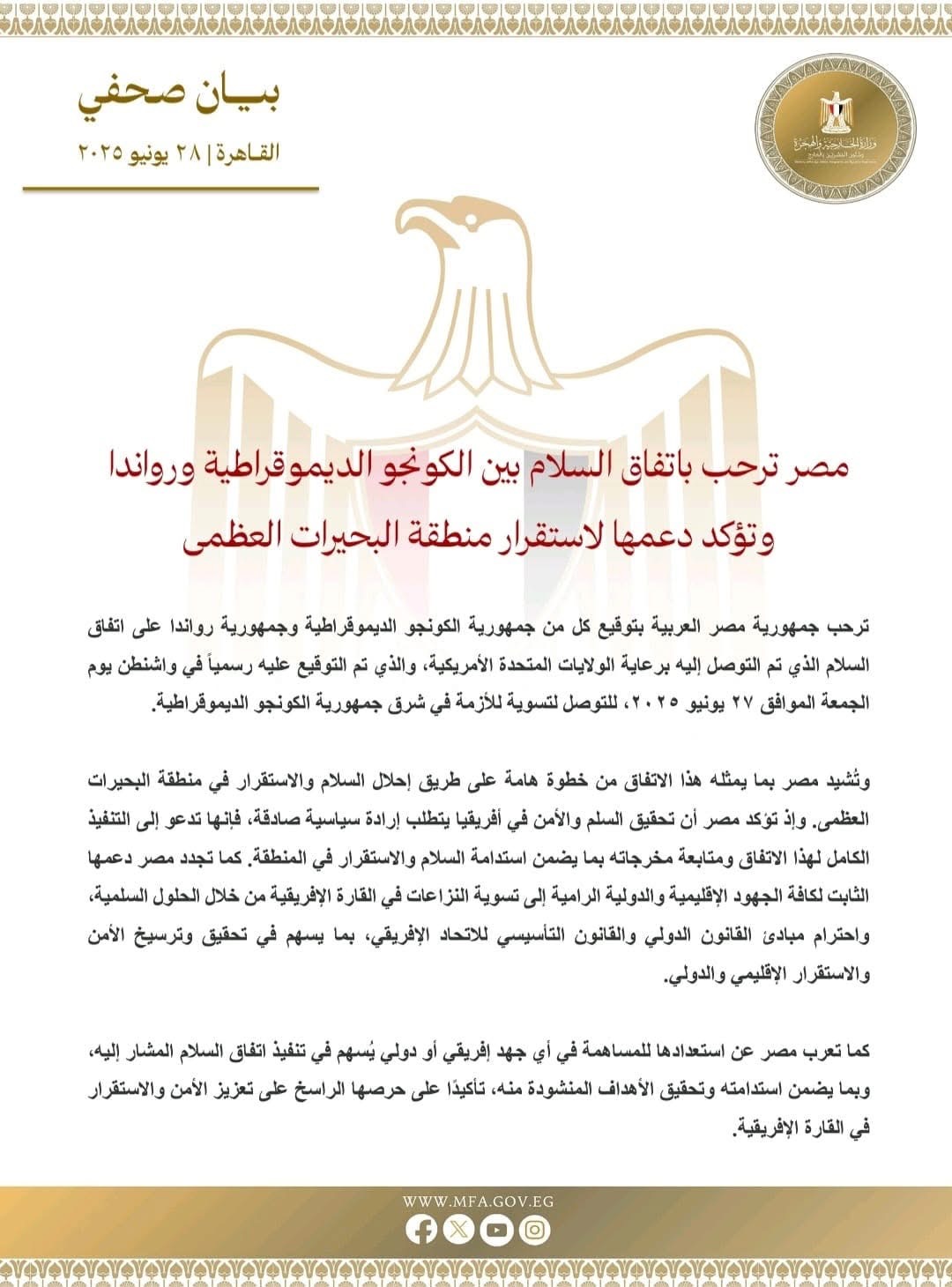 مصر ترحب باتفاق السلام بين الكونجو الديموقراطية ورواندا وتؤكد دعمها لاستقرار منطقة البحيرات العظمى السبت 28 يونيو, 2025