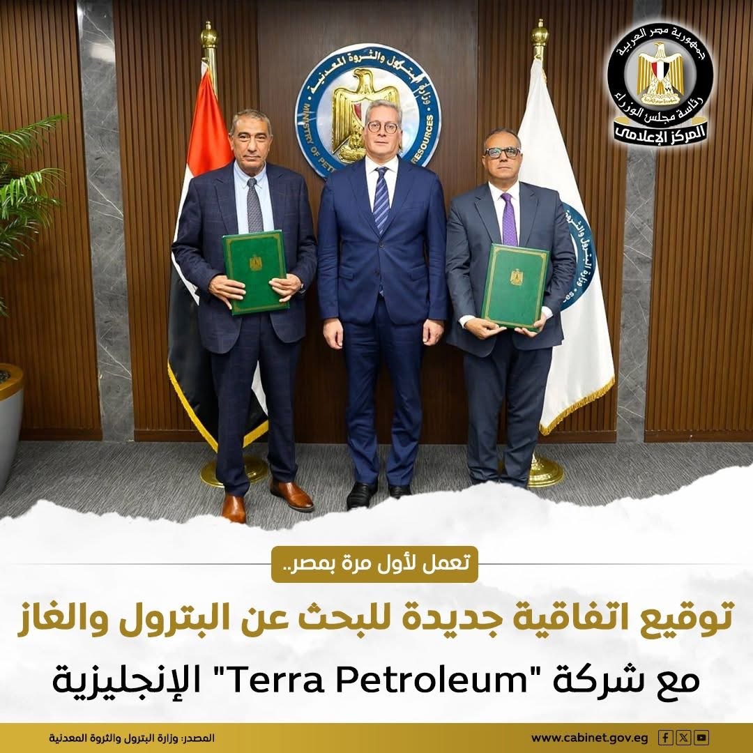 اتفاقيه بين الهيئة المصرية العامة للبترول وشركة "Terra Petroleum" الإنجليزية، وذلك في إطار تنفيذ استراتيجية وزارة البترول والثروة المعدنية لزيادة الاستكشاف والإنتاج الخميس 25 ديسمبر, 2025