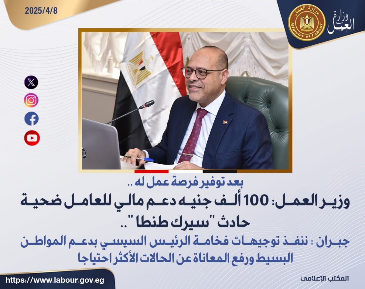 بعد توفير فرصة عمل له.. وزير العمل: 100 ألف جنيه دعم مالي للعامل ضحية حادث "سيرك طنطا الثلاثاء 8 أبريل, 2025