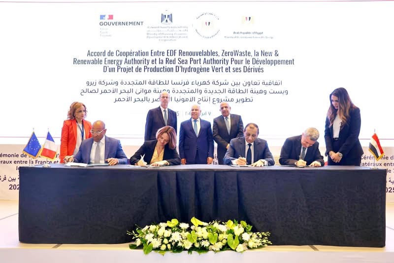 وزراء الصناعة والنقل والكهرباء ووزير الاقتصاد والمالية الفرنسي يشهدون توقيع اتفاقية تعاون لتطوير وتمويل وبناء وتشغيل محطة متكاملة لإنتاج الهيدروجين الأخضر ومشتقاته الثلاثاء 8 أبريل, 2025