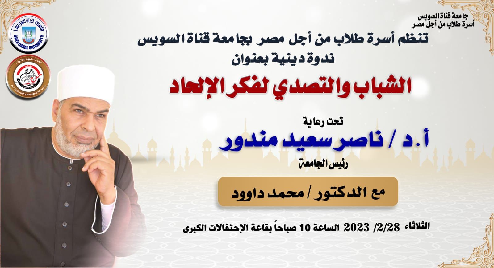 غدا بجامعة القناة ندوة دينية حول الشباب والتصدى لفكر الإلحاد .... يحاضر بها الدكتور محمد داوود الاثنين 27 فبراير, 2023