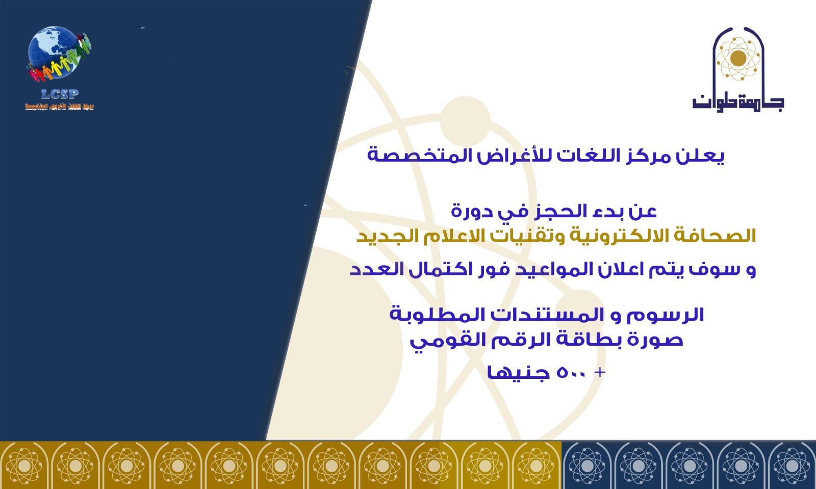 مركز اللغات للأغراض المتخصصة بكلية الآداب جامعة حلوان يعلن عن دورة الصحافة الإلكترونية وتقنيات الإعلام الجديد الاثنين 27 فبراير, 2023