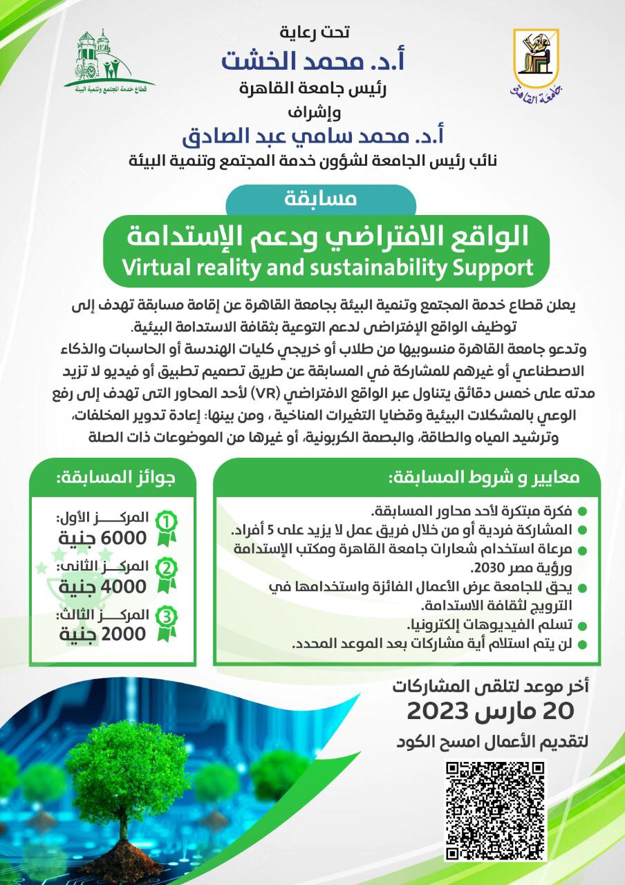 جامعة القاهرة تطلق مسابقة لتوظيف الواقع الافتراضي ودعم التوعية بثقافة الاستدامة البيئية الأحد 5 فبراير, 2023