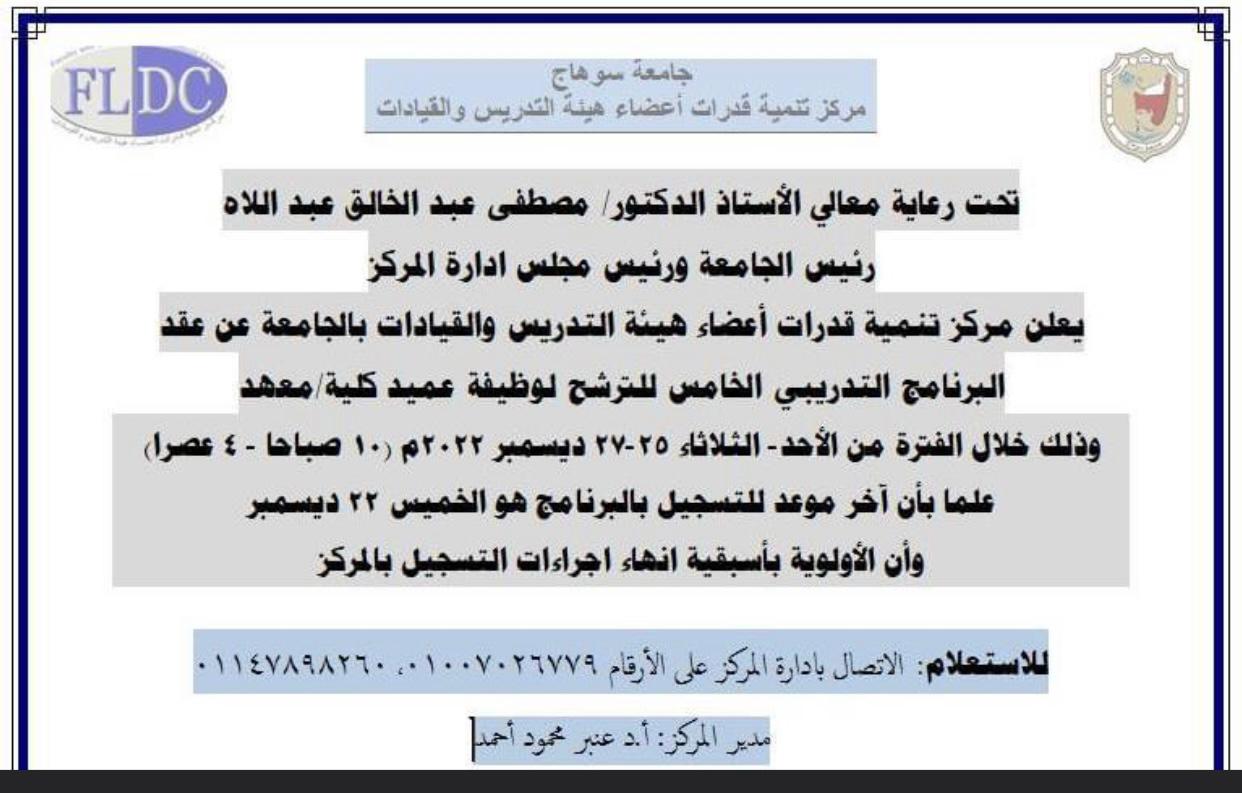 مركز تنمية القدرات بجامعة سوهاج ينظم البرنامج التدريبي الخامس للترشح لوظيفة عميد كلية/معهد الأحد 18 ديسمبر, 2022