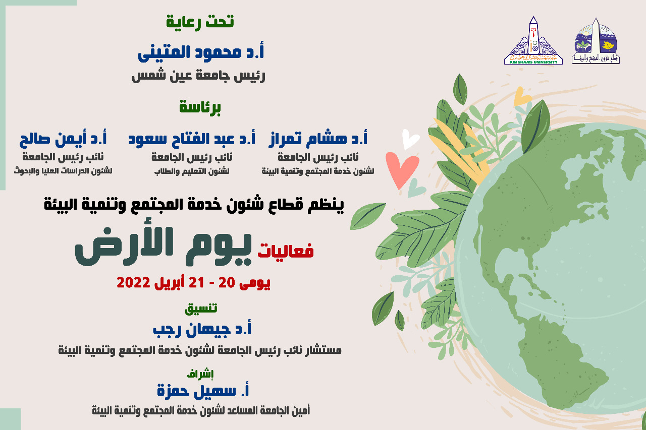 ٢٠ أبريل قطاع خدمة المجتمع وتنمية البيئة بجامعة عين شمس يحتفل باليوم العالمي للأرض الاثنين 18 أبريل, 2022