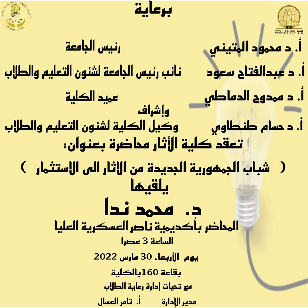 "شباب الجمهورية الجديدة من الآثار إلى الاستثمار" محاضرة عامة لطلاب كلية الآثار بجامعة عين شمس الثلاثاء 29 مارس, 2022