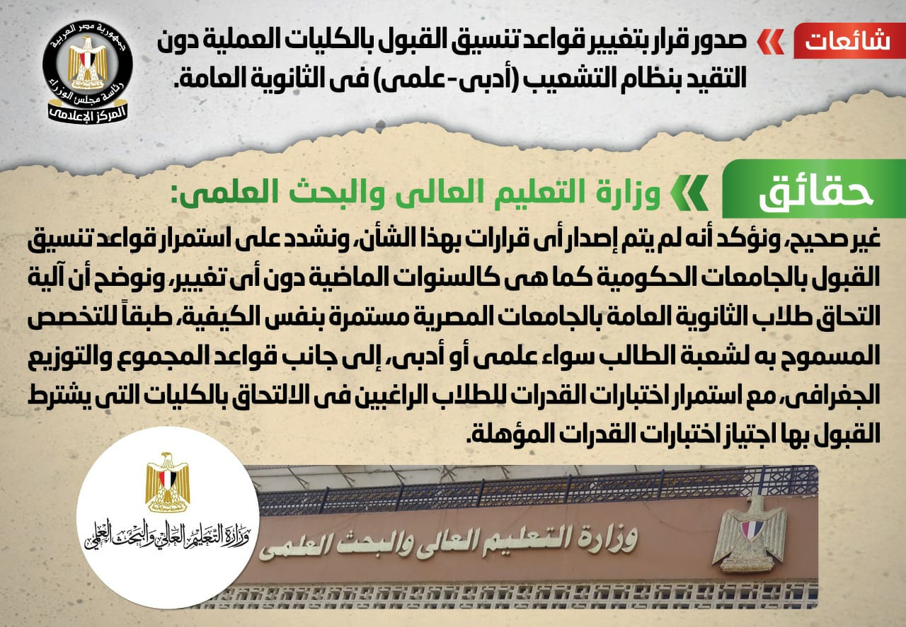 وزارة التعليم العالى تنفى صدور قرار بتغيير قواعد تنسيق القبول بالكليات العملية دون التقيد بنظام التشعيب (أدبي – علمي) في الثانوية العامة الأربعاء 16 مارس, 2022