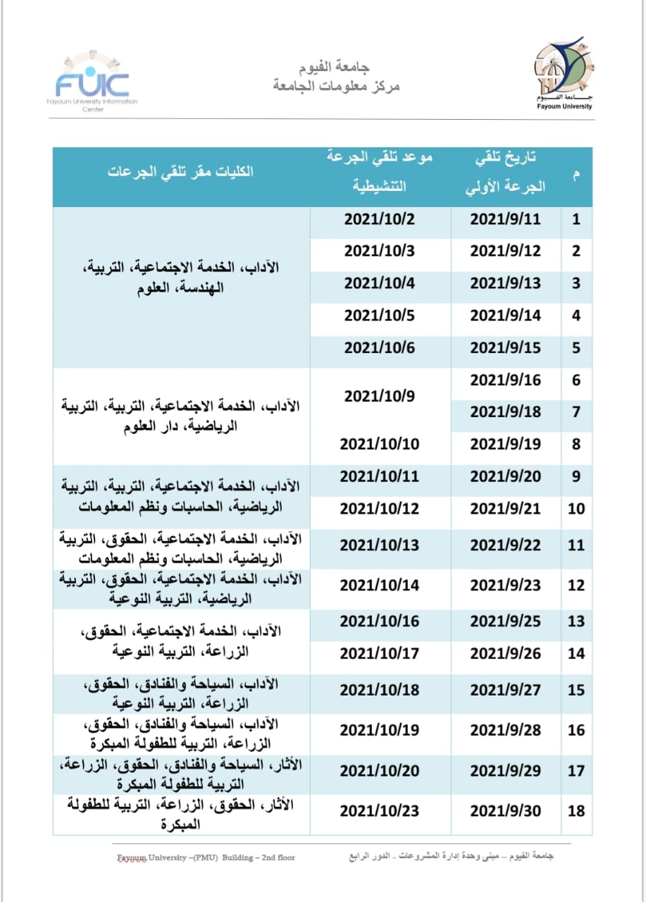جامعة الفيوم تعلن مواعيد حملة إعطاء الجرعة الثانية من لقاح فيروس كورونا المستجد الثلاثاء 28 سبتمبر, 2021