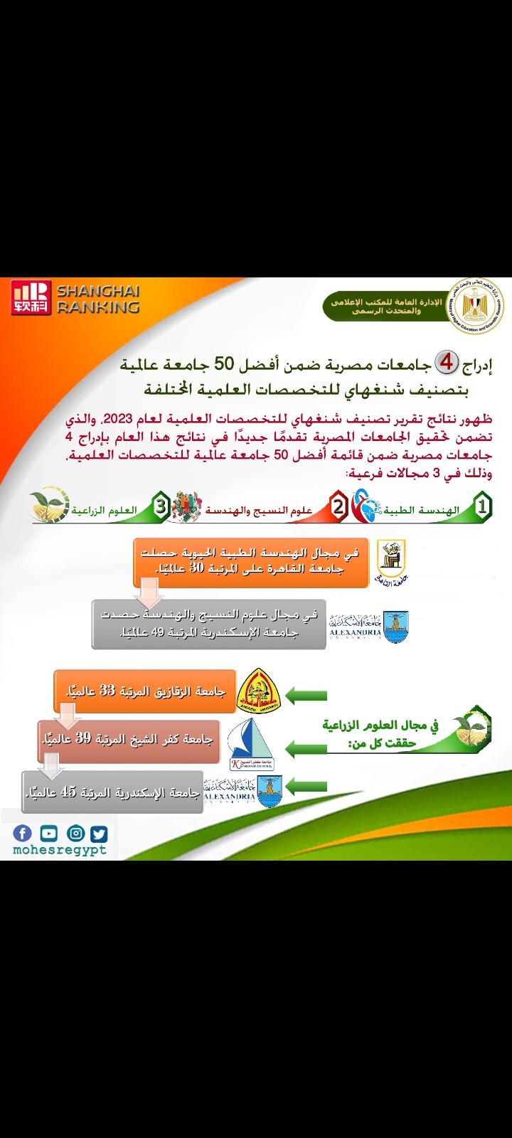 إدراج 4 جامعات مصرية ضمن قائمة أفضل 50 جامعة عالمية بتصنيف شنغهاي للتخصصات العلمية لعام 2023 الأربعاء 1 نوفمبر, 2023