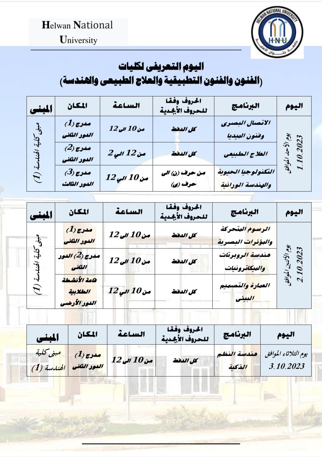 جامعة حلوان الاهلية تعلن عن اليوم التعريفي لكليات الفنون والفنون التطبيقية والعلاج الطبيعي والهندسة السبت 30 سبتمبر, 2023