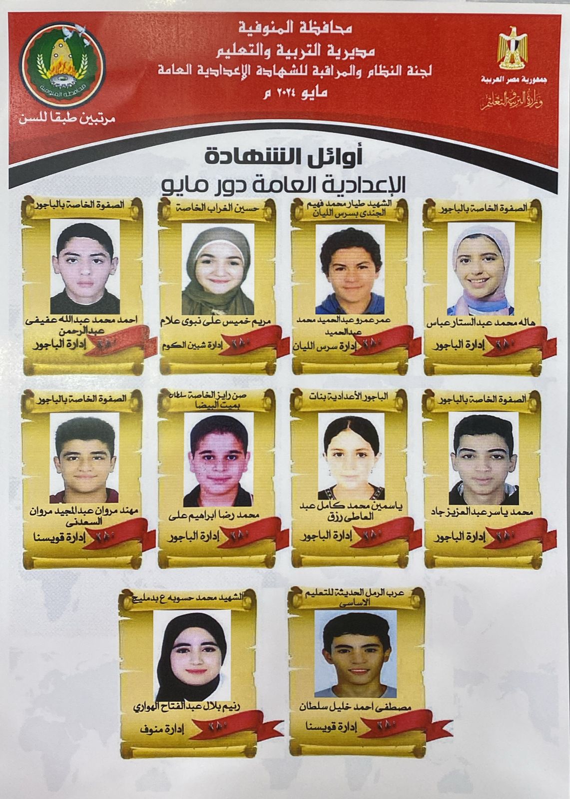 محافظ المنوفية : 92 طالب وطالبة يحصدون الدرجات النهائية بالشهادة الإعدادية ويقدم خالص تهانيه القلبية للطلاب السبت 8 يونيو, 2024