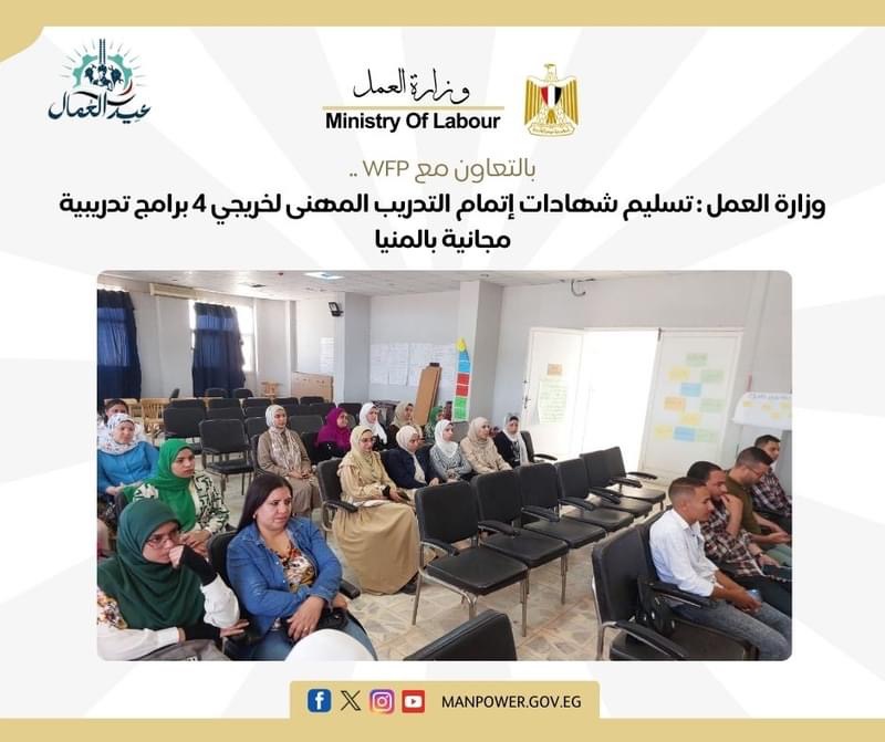 بالتعاون مع WFP .. وزارة العمل : تسليم شهادات إتمام التدريب المهنى لخريجي 4 برامج تدريبية مجانية بالمنيا الأحد 26 مايو, 2024