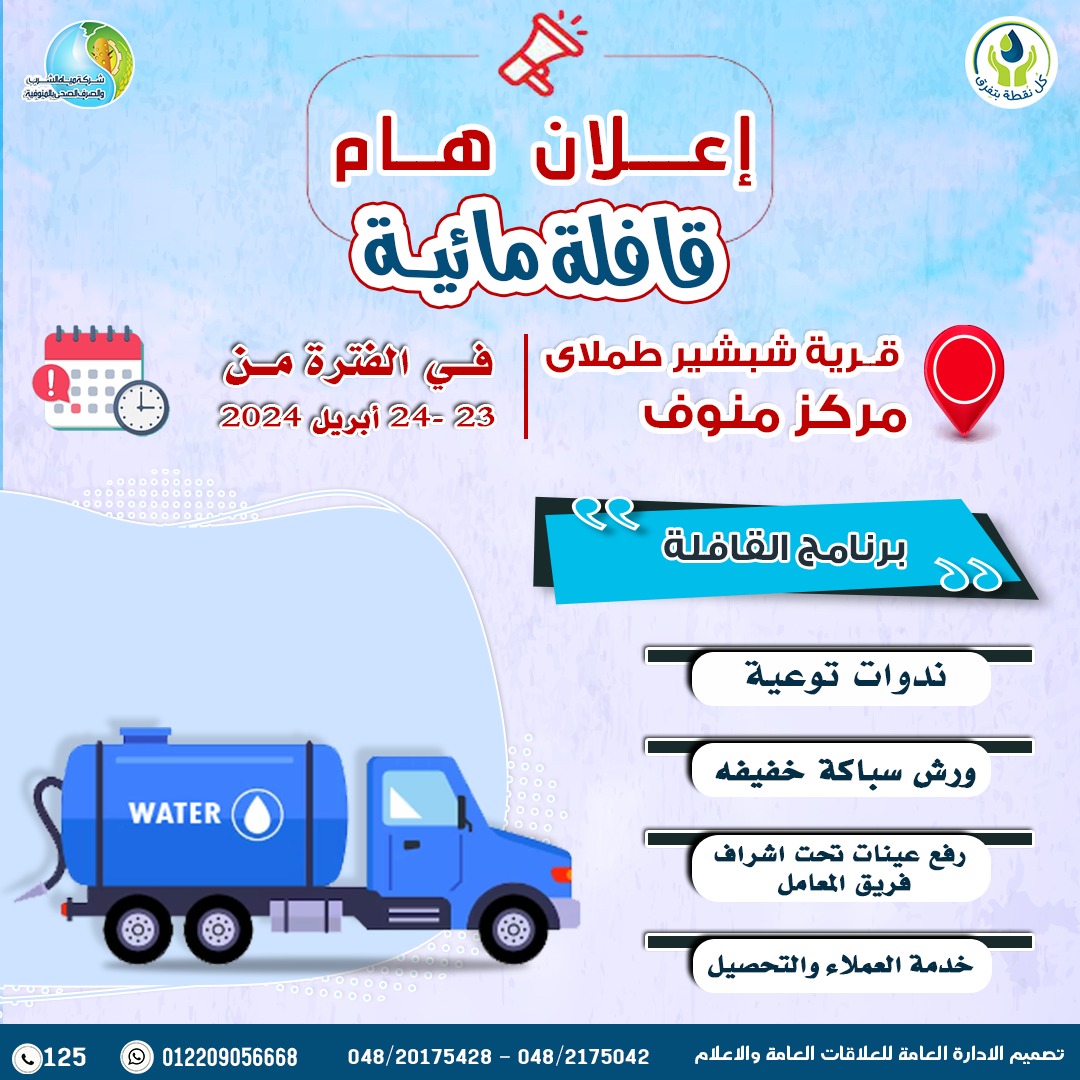 مياه المنوفية: غداً انطلاق فعاليات القافلة المائية الخدمية بقرية شبشير طملاي مركز منوف الاثنين 22 أبريل, 2024