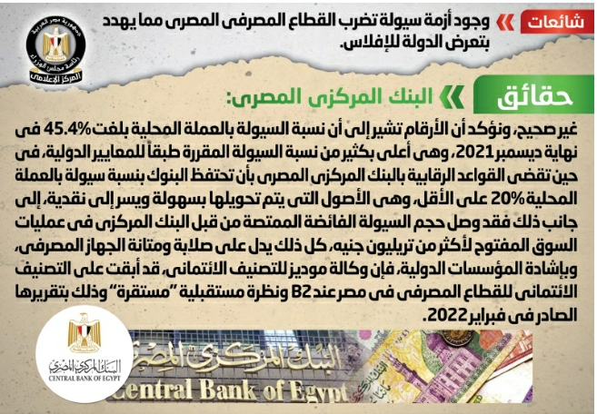 البنك المركزى ينفى وجود أزمة سيولة تضرب القطاع المصرفي المصري مما يهدد بتعرض الدولة للإفلاس الجمعة 25 فبراير, 2022