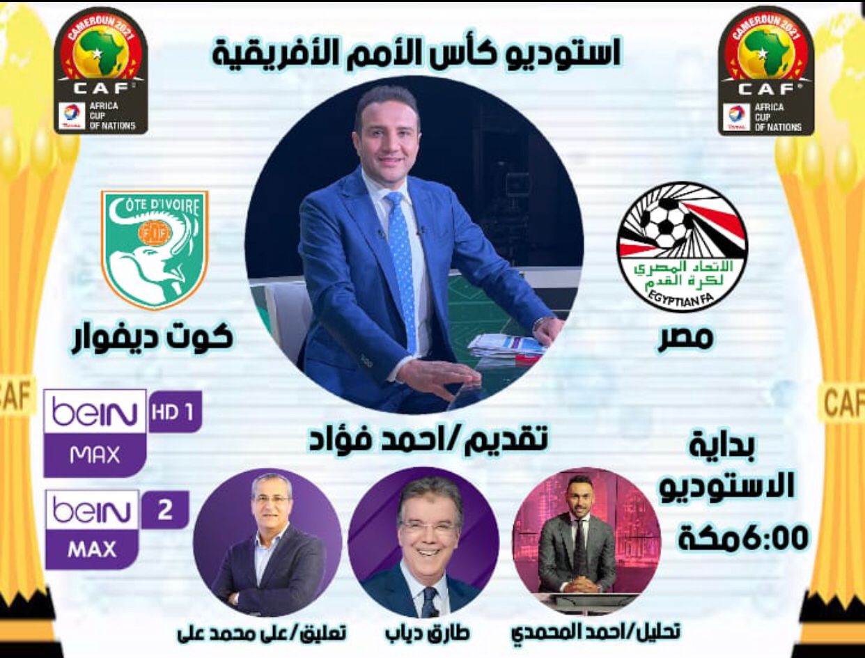 غدا أحمد فؤاد والمحمدي وطارق دياب بالاستديو التحليلي لمباراة مصر وكوت ديفوار بقناة بن سبورت Max 1 الثلاثاء 25 يناير, 2022