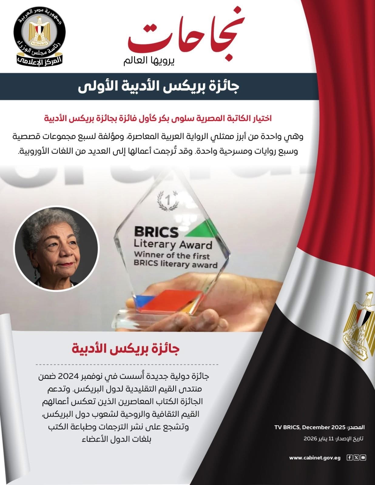 تأكيدًا على دور الأدب كأحد أهم الطرق للتعرف على ثقافات الشعوب الأخرى.سلوى بكر تفوز بجائزة بريكس الأدبية الأحد 11 يناير, 2026